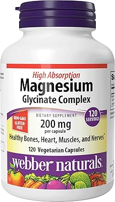Webber Naturals Magnesium Glycinate Complex 200 mg, 120 Vegetarian Capsules, High Absorption Formula, Supports Bones, Heart, Muscles & Nerves, One-per-Day, Vegan, New Label!